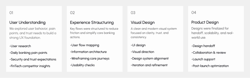 The design process for Core Cash follows a Lean UX approach focused on clarity, security, and scalability. The work was structured into four clear phases to ensure every design decision aligns with real user needs, financial trust, and product goals.