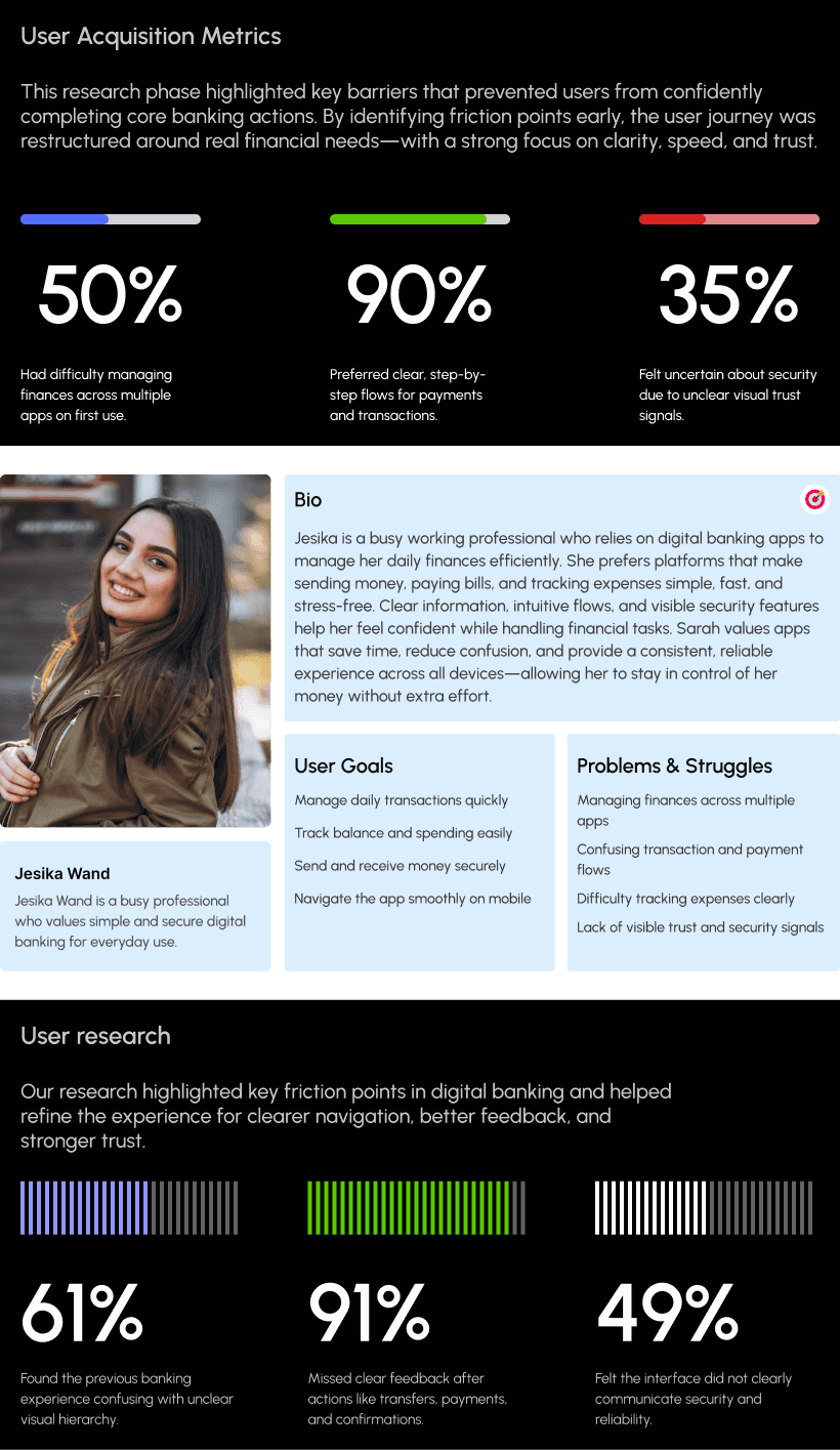 Understanding real user behavior was a core part of designing Core Cash. Research focused on how users interact with digital banking apps, manage transactions, and build trust while handling money. The goal was to identify friction points and turn them into opportunities for clarity, confidence, and security.